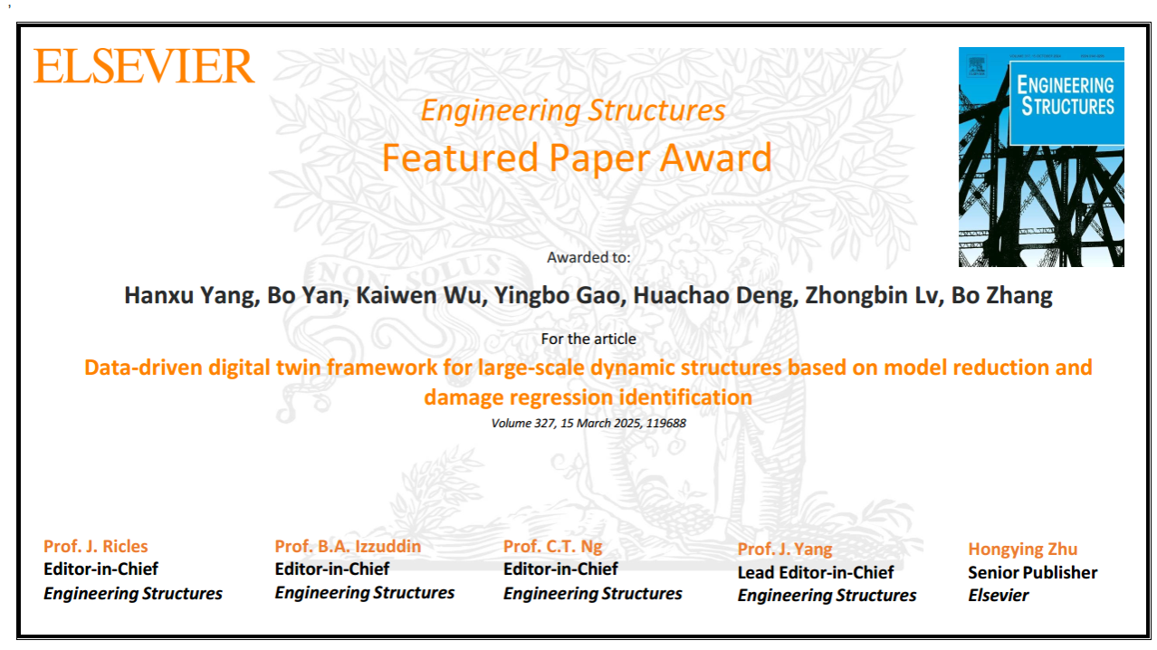 详情2025年8月5日,结构工程领域权威期刊Engineering Structures编辑部公布了该期刊最佳论文奖(Featured Paper Award)遴选结果。由海角网 杨寒旭博士、严波教授、吴楷文博士、高英博博士、邓华超副教授、国网河南电力科学研究院吕中宾总工、张博高工合作完成的发表于该期刊2025年第327卷的论文“Data-driven digital twin framework for large-scale dynamic structures based on model reduction and damage regre...