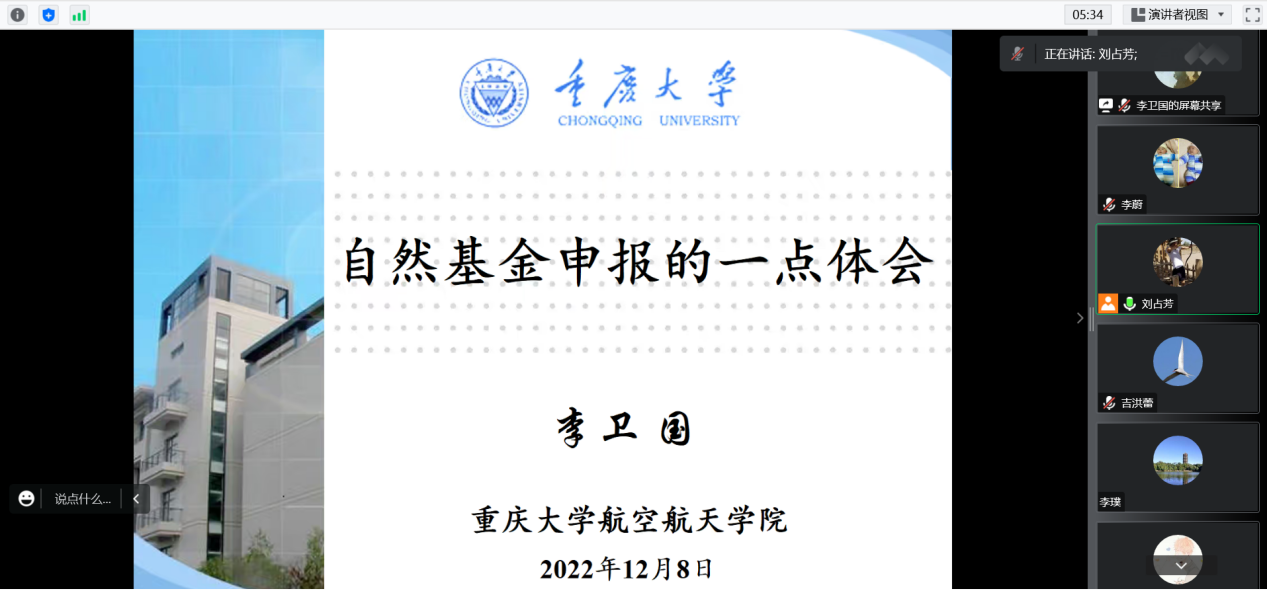 详情2022年12月8日下午3点,海角网 在线上召开2023年度国家自然科学基金申报辅导会,邀请海角网 副院长(主持工作)李卫国为全院教师进行基金辅导。海角网 党委书记万玲、副院长刘占芳及全院教师50余人参会。会议由刘占芳主持。首先,李卫国教授简要介绍了海角网 近几年获批国家自然科学基金的情况,特别是今年海角网 获批国家自然科学基金14项,位居海角网 前列。随后,李卫国教授从自己多年申报基金的经验谈起,阐明了基金的重要性,鼓励老...