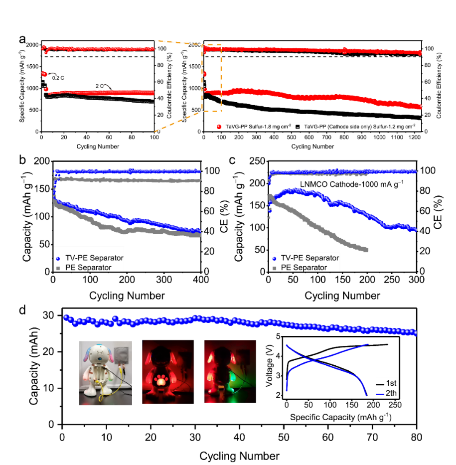 Recently, Prof. Xu’s group developed a composite separator by simply casting functional TV-layer on commercial polyolefin membrane to improve the Li+ transport behavior, modify SEI structure, and regulate the Li+ ion deposition, which result in dense cobblestone state rather than dendrites on the lithium terminal under long time cycling and high deposition capacity. Simultaneously, the functional layer facing the sulfur cathode shows targeted electrochemical catalysis towards sulfur species conversion. As a result, the designed separator enabled a dendrite-free Li anode for up to 6000 and 4200 h cycling for the TV-PP separator and TV-PE separator, respectively. The designed separator shows a wide compatibility in typical LMBs systems, not only achieving a high capacity of 3 mAh cm−2 after 150 cycles in LSBs, but also guaranteeing stable cycling performances in the full LIBs with commercial LFP and LMNCO-622 cathode. The soft-packaged thin batteries with the designed separator can stably cycle for 80 and 50 cycles with a LMNCO-622 and sulfur cathode, respectively. This separator engineering strategy solves the problems in LMBs from the perspective of electrochemical process initially at both lithium and sulfur cathode surface/interface. Additionally, the light weight (0.15 mg cm-2), mechanically stable (bearing up to 30 mAh cm-2 lithium deposition capacity without battery failure) and thermal tolerance (suffering 130 oC for 11 h without obvious thermal shrinkage) properties of the designed separator shows a wide practical application potential in future LMBs.