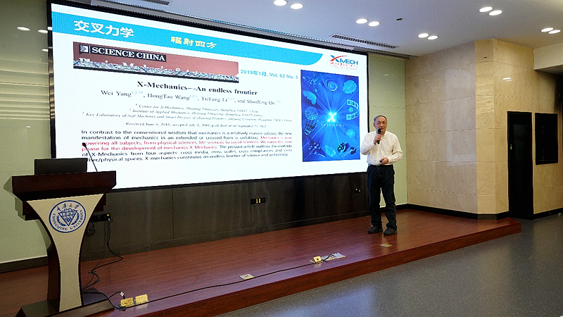 在报告中,杨卫结合浙江大学交叉力学中心的创建和发展,详细介绍了中心在介质交叉、层次交叉、刚柔交叉、质智交叉等方面的研究进展,以极为生动和丰富的案例,深入浅出地展示了交叉力学广阔的发展前景。