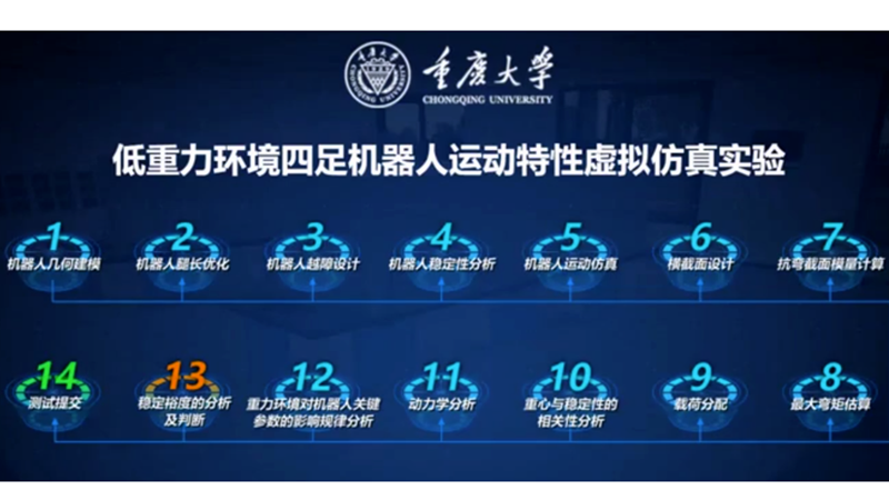 万玲教授任负责人,杨昌棋教授、张元勋副教授、张晓敏教授、张亮教授等主要成员参与设计开发的“低重力环境四足机器人运动特性虚拟仿真实验”获批国家虚拟仿真实验教学一流课程。该虚拟仿真实验教学借助现代信息技术、人工智能技术与实验教学的深度融合,有效解决实际实验教学项目中存在的“不能做”、“不敢做”、“不好做”等问题,是海角网