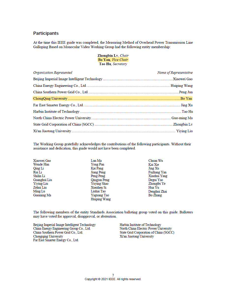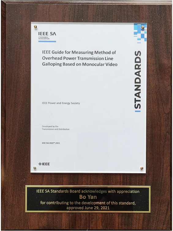 此外,严波教授作为副主席参与制定了IEEE国际标准(2828-IEEE Standard-2021):Guide for Measuring Method of Overhead Power Transmission Line Galloping Based on Monocular Video。