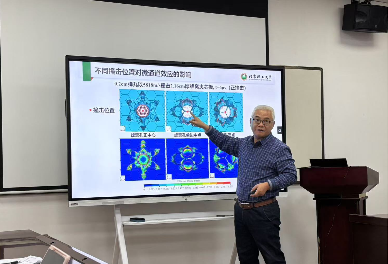 师生们对弹丸超高速碰撞撞击蜂窝夹芯板产生碎片云的现象和机理有了更为全面且深刻的认识。报告最后,陈立明教授代表工程学部向陈小伟教授赠送了纪念奖牌。