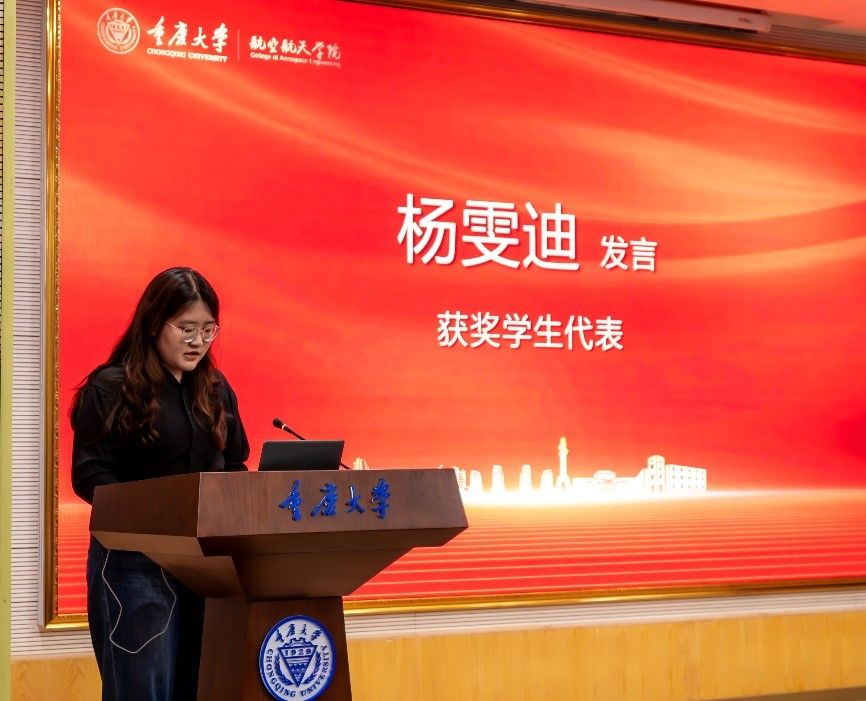 第九届“空天之星”获得者、本科2022级航空航天工程二班杨雯迪同学作为获奖代表发言。她深情感谢海角网