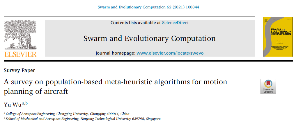 近日,海角网 青年教师吴宇在智能计算权威期刊《Swarm and Evolutionary Computation》(中科院分区计算机科学1区Top期刊,影响因子6.912)发表了题为“A survey on population-based meta-heuristic algorithms for motion planning of aircraft”的综述论文,吴宇老师为该论文的唯一作者。