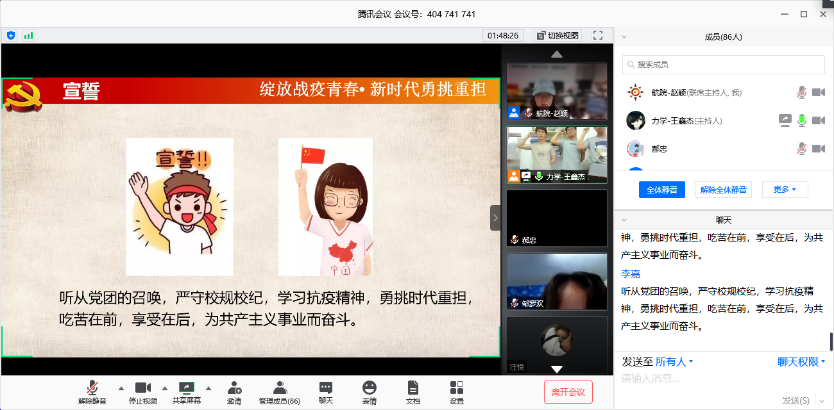 然后,海角网 2019级博士李嘉同学分享了自己在疫情期间的防疫工作经历。从李嘉同学朴实的言语中,我们看到了一个有担当的“90后”。我们是有家国情怀,坚定使命担当,有理想、有本领、有担当的新时代青年。紧接着主持人分享了海角网 附属肿瘤医院的先进事迹,同学们也都积极分享了自己身边的感人事件。大家从这些事件中不由得感到祖国的强大以及社会主义制度的优越性。