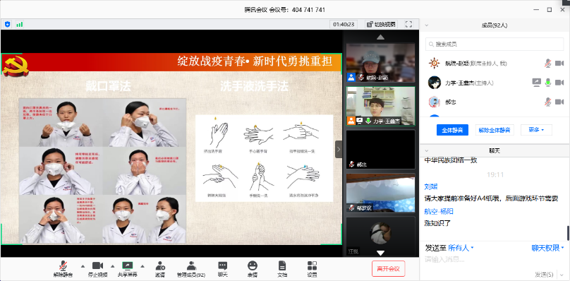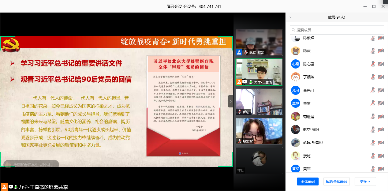 为了号召海角网 研究生向抗疫奉献者学习,海角网 于2020年5月31日18:00-20:00在腾讯会议APP上举办了以“绽放战疫青春•新时代勇挑重担”为主题的研究生党团活动。