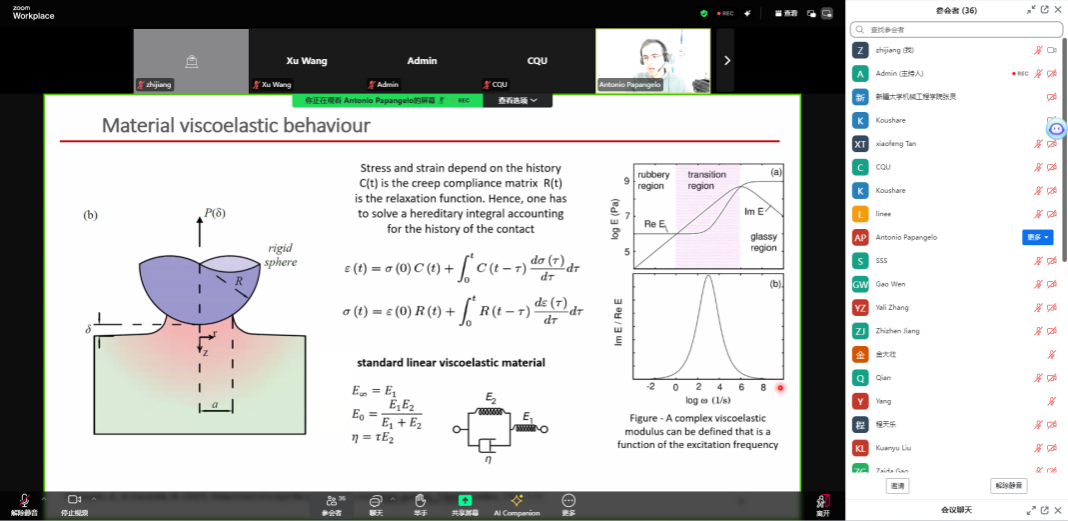 在报告中,Papangelo教授详细阐述了软粘弹性材料在日常生活中的广泛应用,并指出像弹性体、硅胶和橡胶等材料在使用过程中表现出的时间依赖性行为,这为材料建模带来了独特的挑战和机遇。特别是在全球向碳中和的社会背景下,深入理解这些材料的接触力学对解决技术难题和开发高效的工程解决方案至关重要。他进一步探讨了裂纹尖端速度在半无限固体中对表观界面韧性的影响,强调通过合理选择接触几何形状和加载方案,可以精确调控粘附力,从而为控制接触相互作用提供新的策略。