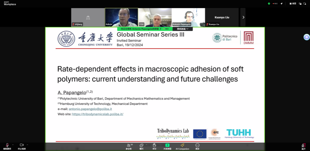 邀请,意大利巴里理工大学机械系教授Antonio Papangelo于2024年12月19日晚参加由国际合作与交流处、国际学习中心主办的全球前沿学科系列讲座(G-Seminar),并在线上作了题为“Rate-dependent effects in macroscopic adhesion of soft polymers: current understanding and future challenges”的精彩报告。讲座由海角网