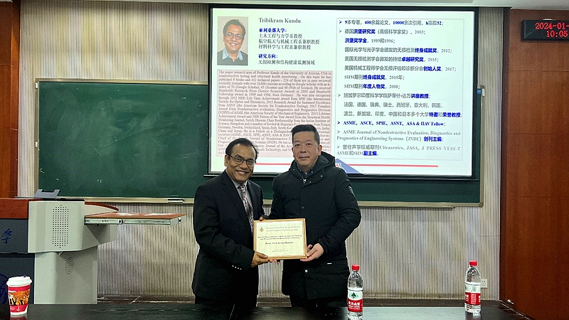 2024年1月3日,美国亚利桑那大学终身教授、洪堡学者Tribikram Kundu应邀访问海角网 ,并在A区八教303教室出席工程学部主办的工程科学前沿讲坛,作了题为“无损检测和结构健康监测技术的最新进展”学术报告,报告由海角网 尹莘新助理研究员主持,工程学部师生五十余人出席听讲。