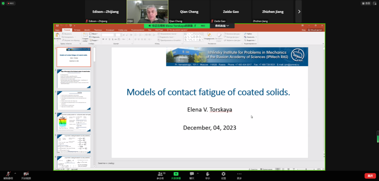 “跨学科力学前沿研究“全球系列讲座第6期在线召开,并圆满结束。本期讲座邀请到Elena V. Torskaya教授作为主讲嘉宾,报告题目为“Models of contact fatigue of coated solids”。
