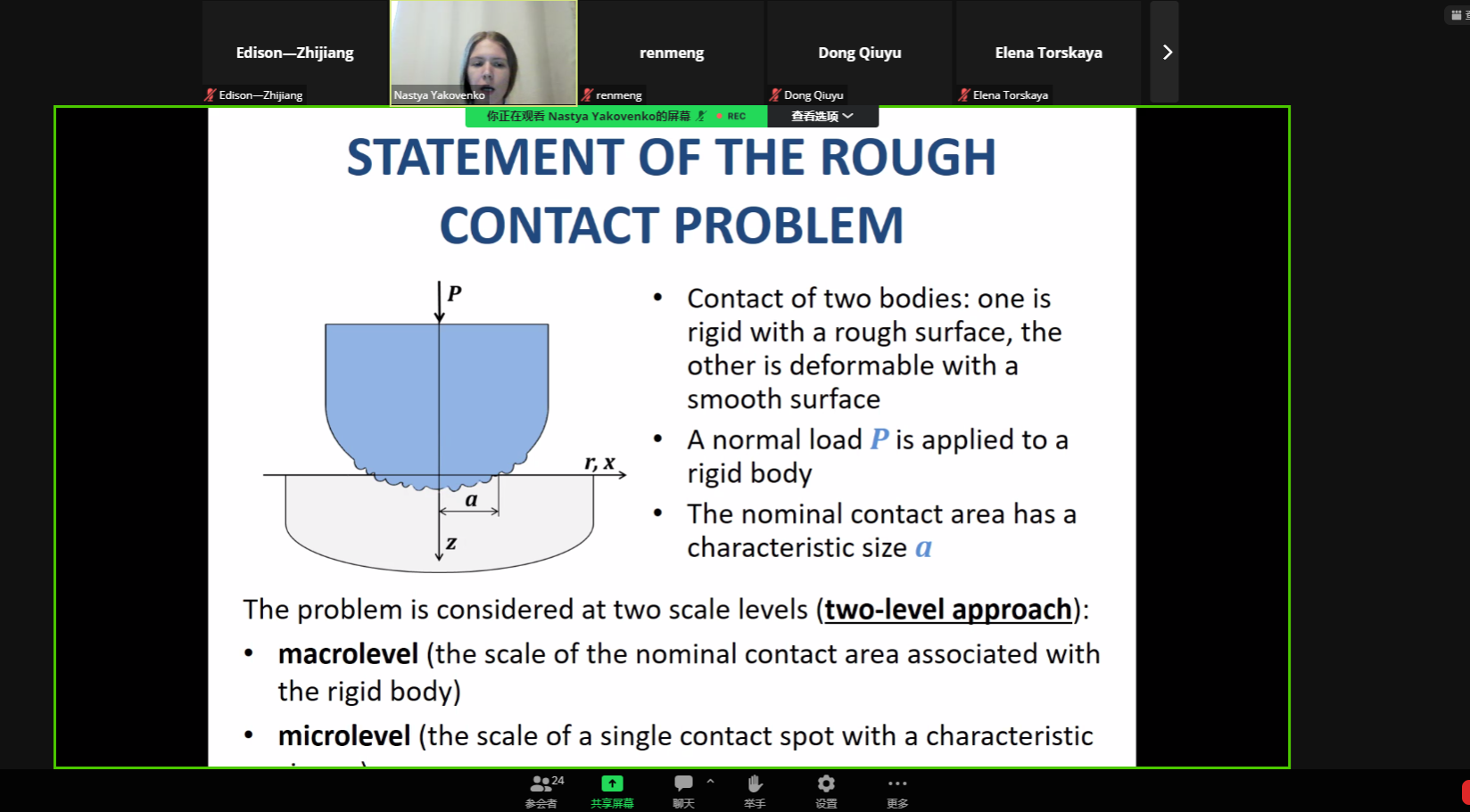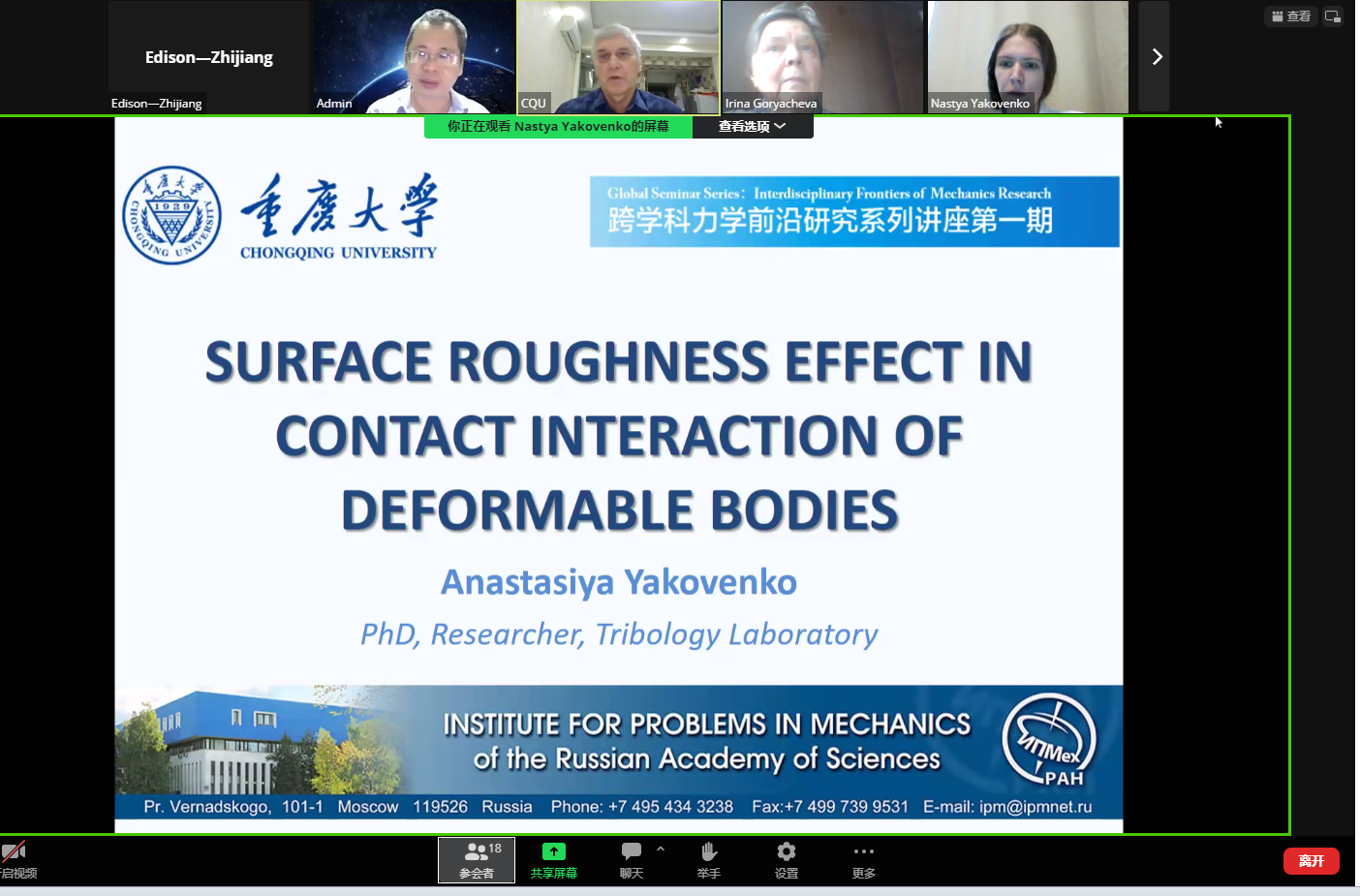 Feodor M. Borodich教授介绍了本次讲座的安排及嘉宾背景。Anastasiya Yakovenko博士是Ishlinsky力学研究所摩擦学实验室的研究员,考虑物体表面几何形状的物体接触分析建模领域的专家。本硕博均就读于莫斯科物理技术海角网