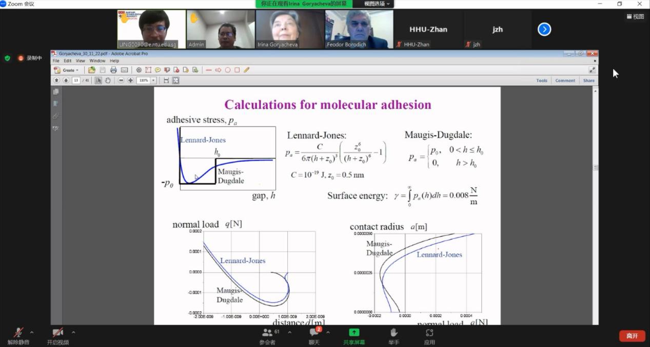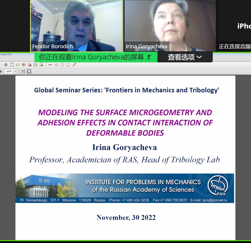 俄罗斯科海角网 外籍院士Fedor Borodich介绍了本次讲座的安排及嘉宾背景。Goryacheva教授担任俄罗斯科海角网 Ishlinsky力学问题研究所摩擦学实验室主任,莫斯科国立罗蒙诺索夫大学教授。她是俄罗斯国家理论与应用力学委员会主席、俄罗斯摩擦学委员会主席、RZD 科学委员会成员、国际摩擦学委员会副主席以及 IUTAM 主席团成员。 Goryacheva 教授发表了200多篇出版物,其中包括7部专著,分别荣获列宁共青团奖(1979年)、奥林匹亚国家妇女科学成就奖(2005年)、政府科技奖(2006年)和世界摩擦学金奖(2009年)。